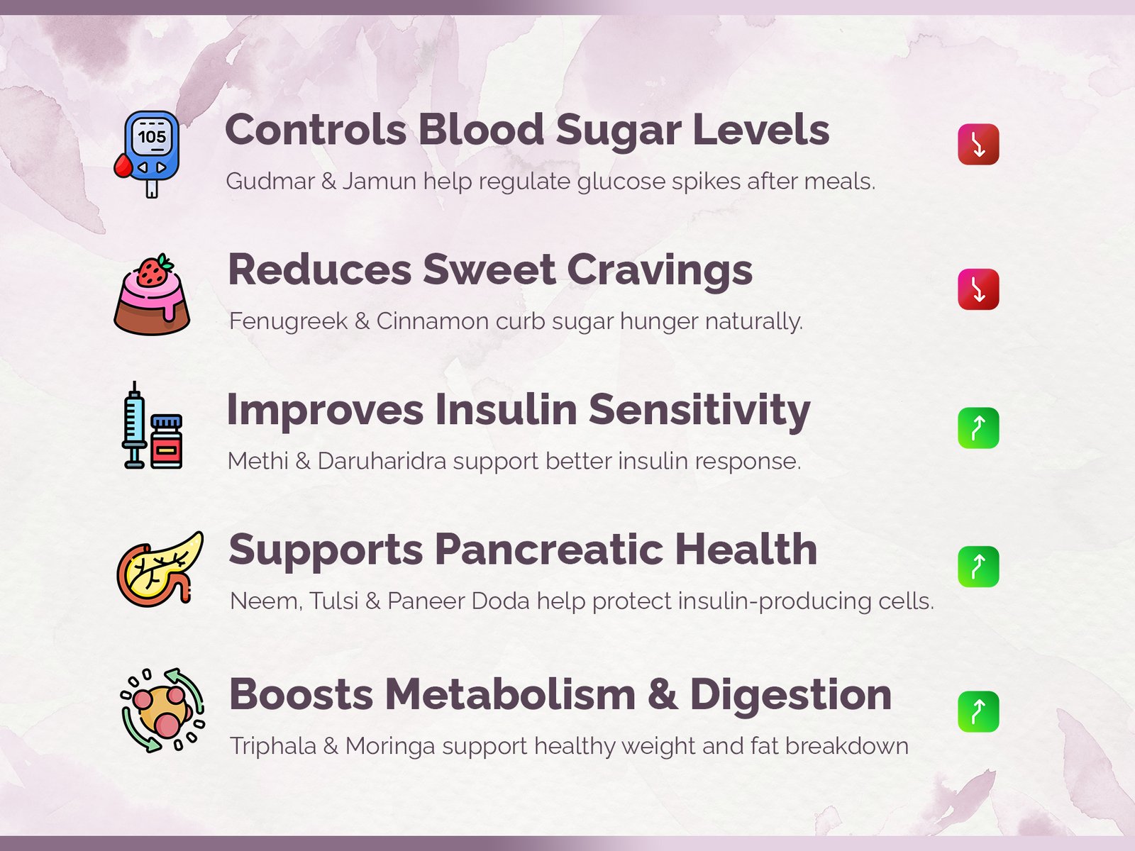A clinically proven Ayurvedic blend of 14 potent herbs like Gudmar, Jamun, Methi, and Karela—crafted to help regulate blood sugar levels, improve insulin response, and support long-term metabolic health.