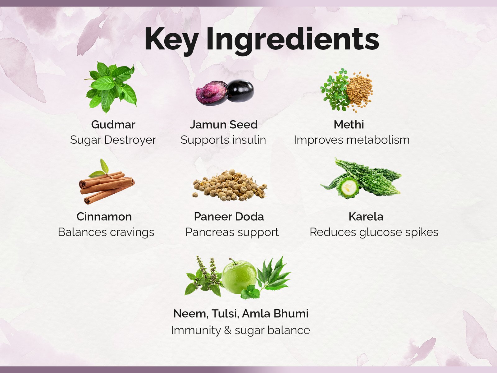 Gudmar, Jamun, Paneer Doda, Cinnamon, Methi, Triphala, Neem, Tulsi, Fennel Seed, Karela,