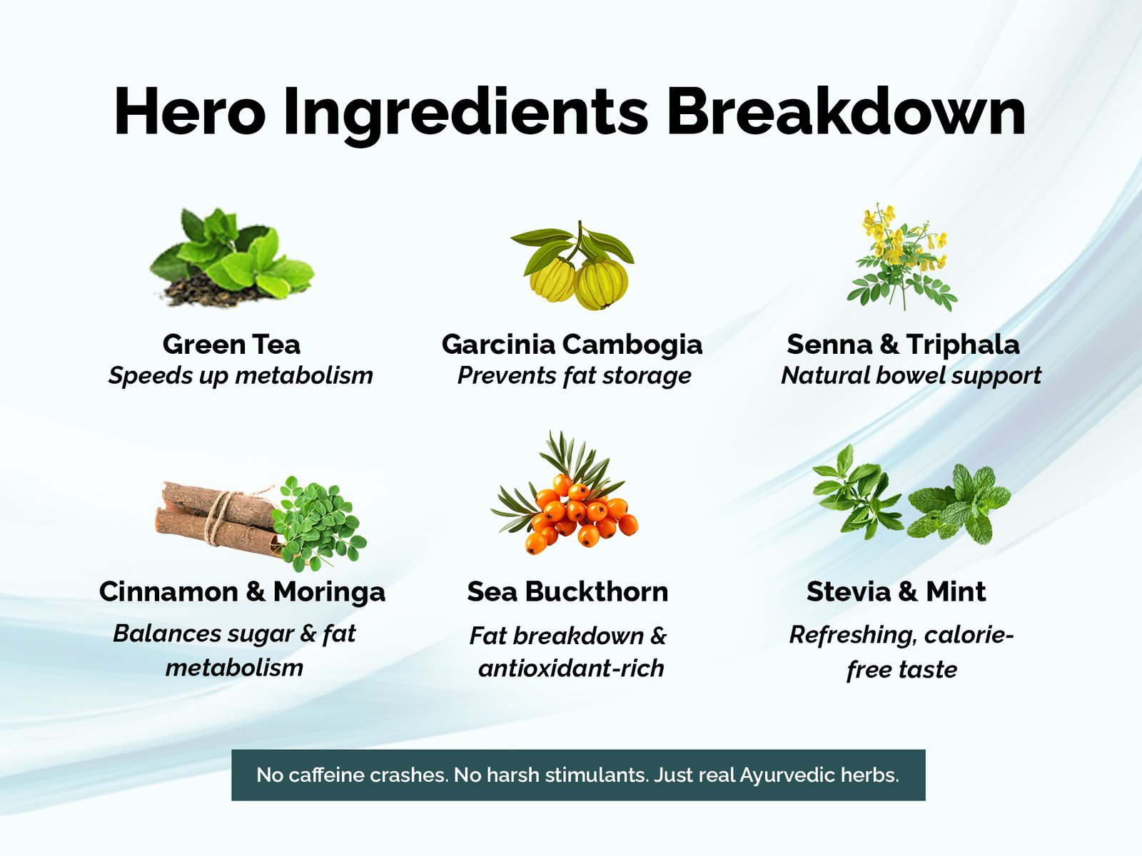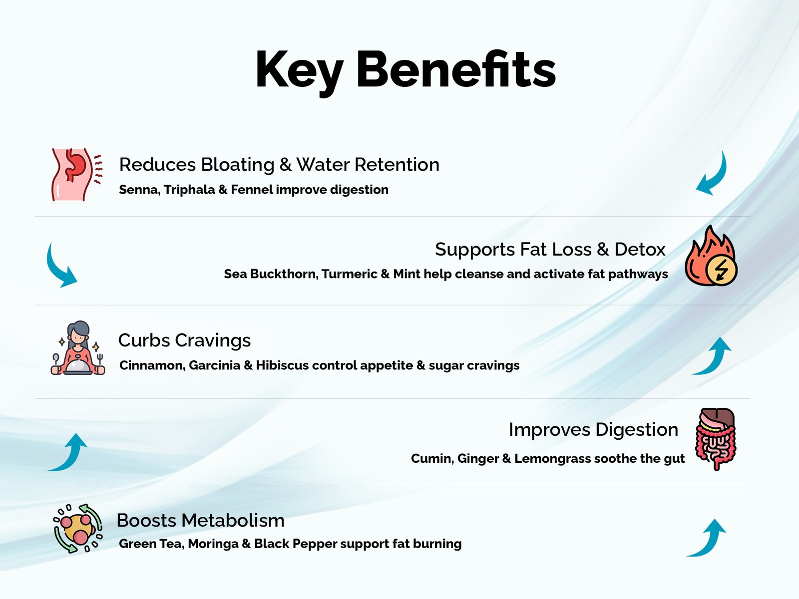A powerful blend of 19 Ayurvedic herbs and botanicals including Green Tea, Garcinia, Cambogia, Cinnamon, Senna, and Triphala—crafted to help burn fat, improve digestion, curb cravings, and support healthy weight management.