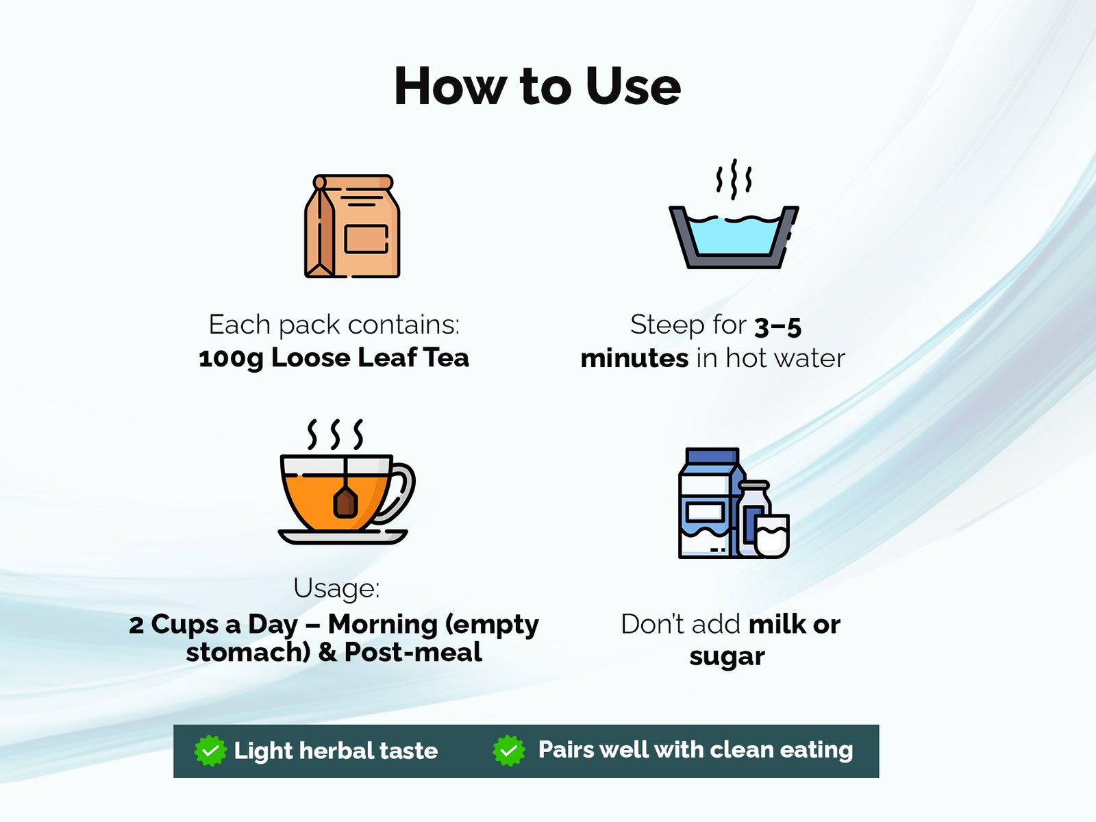 For best results: Drink twice daily — once in the morning (empty stomach) and post-lunch or