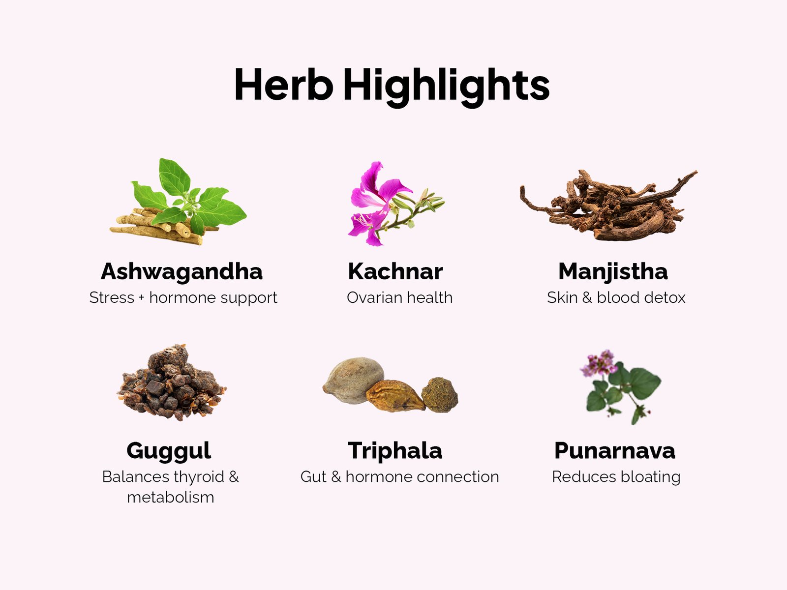 A hormone-balancing blend of 13 powerful Ayurvedic herbs like Ashwagandha, Kachnar, Manjistha, and Triphala. Crafted to reduce PCOD symptoms like irregular periods, acne, bloating, mood